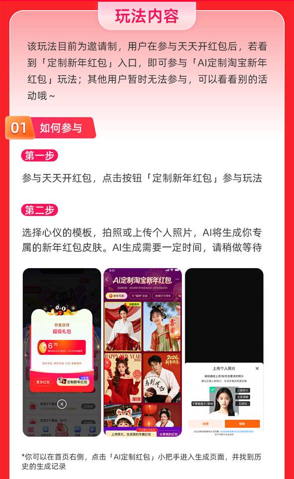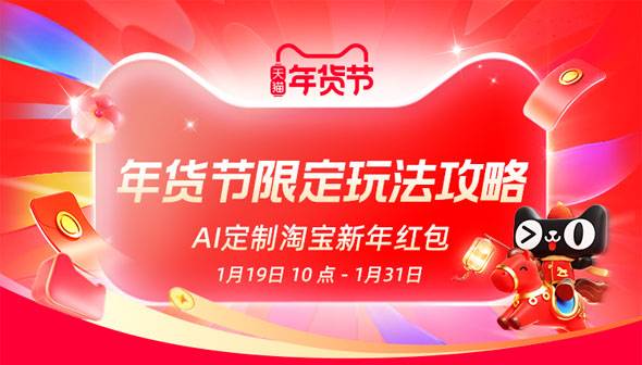 2026年1月16星期五消息: 过年发红包还在用千篇一律的封面?2026年淘宝年货节直接把「仪式感」拉满——**AI定制淘宝新年红包**正式上线!2026年1月19日10点-1月31日,用你的照片生成专属红包皮肤,发出去的不仅是红包,更是独一份的新年惊喜。