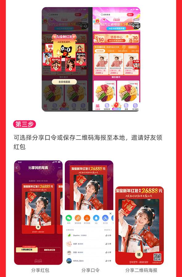 2、**好友共赢福利**:分享你的定制红包口令/二维码,好友领红包时能看到你的专属皮肤,还能冲击最高**26888元淘宝新年红包**,薅羊毛也要一起快乐!
