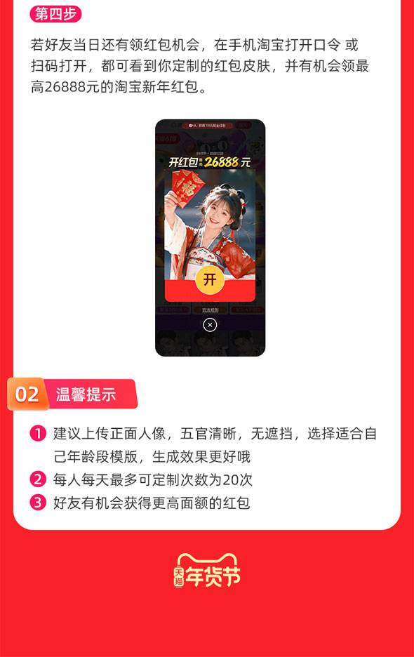 好友当天还有领红包机会的话,打开口令/扫码就能看到你的定制皮肤,同时有机会开出最高26888元的淘宝新年红包,欧皇说不定就是你身边的TA!